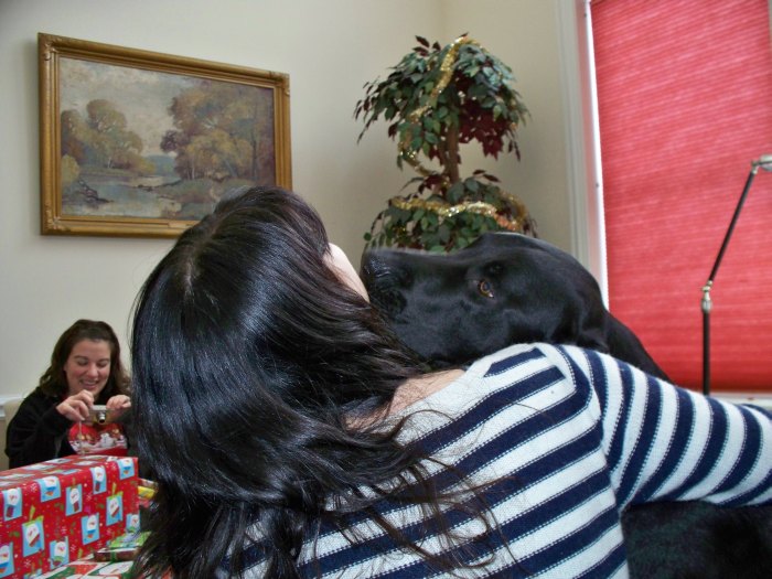 Tom and Rudy are very much into the holiday spirit. Tom gives Kathy a big wet kiss as she opens a gift.