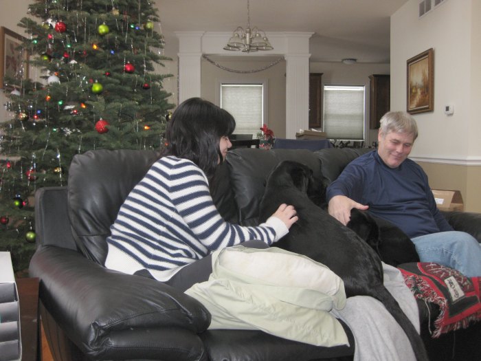 After gifts were opened Tom climbed up on the couch next to Kathy.